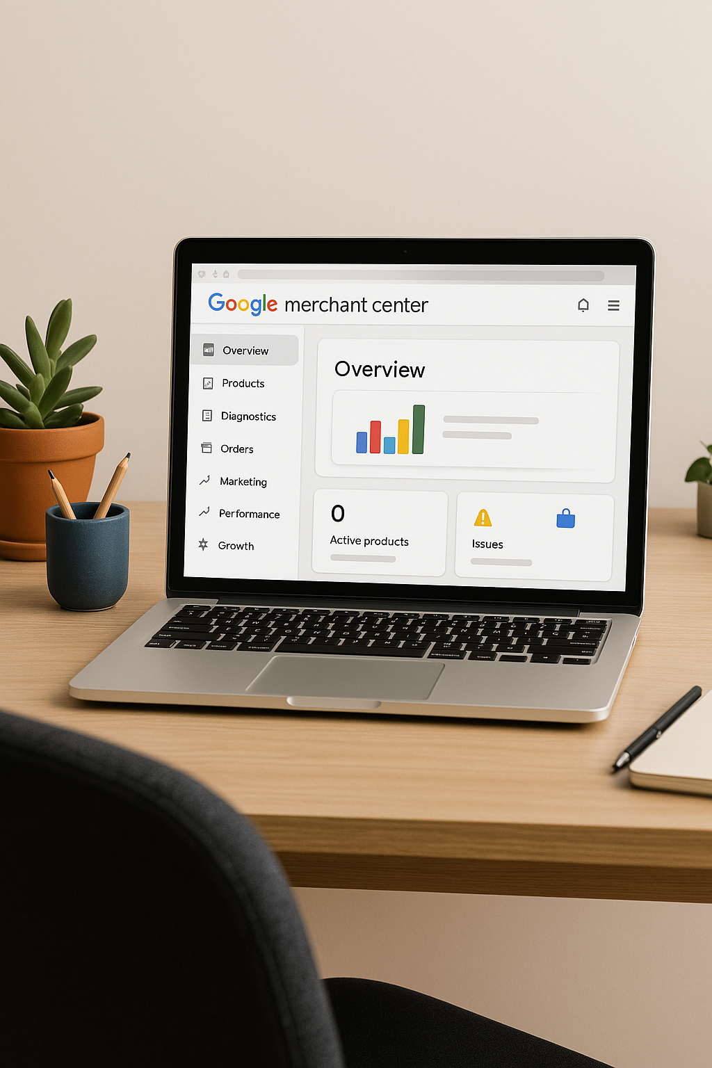 Wir erstellen dein Merchant Center, verknüpfen es mit deiner Domain, Google-Konten und richten grundlegende Einstellungen ein (Versand, Steuern, Rechtliches).